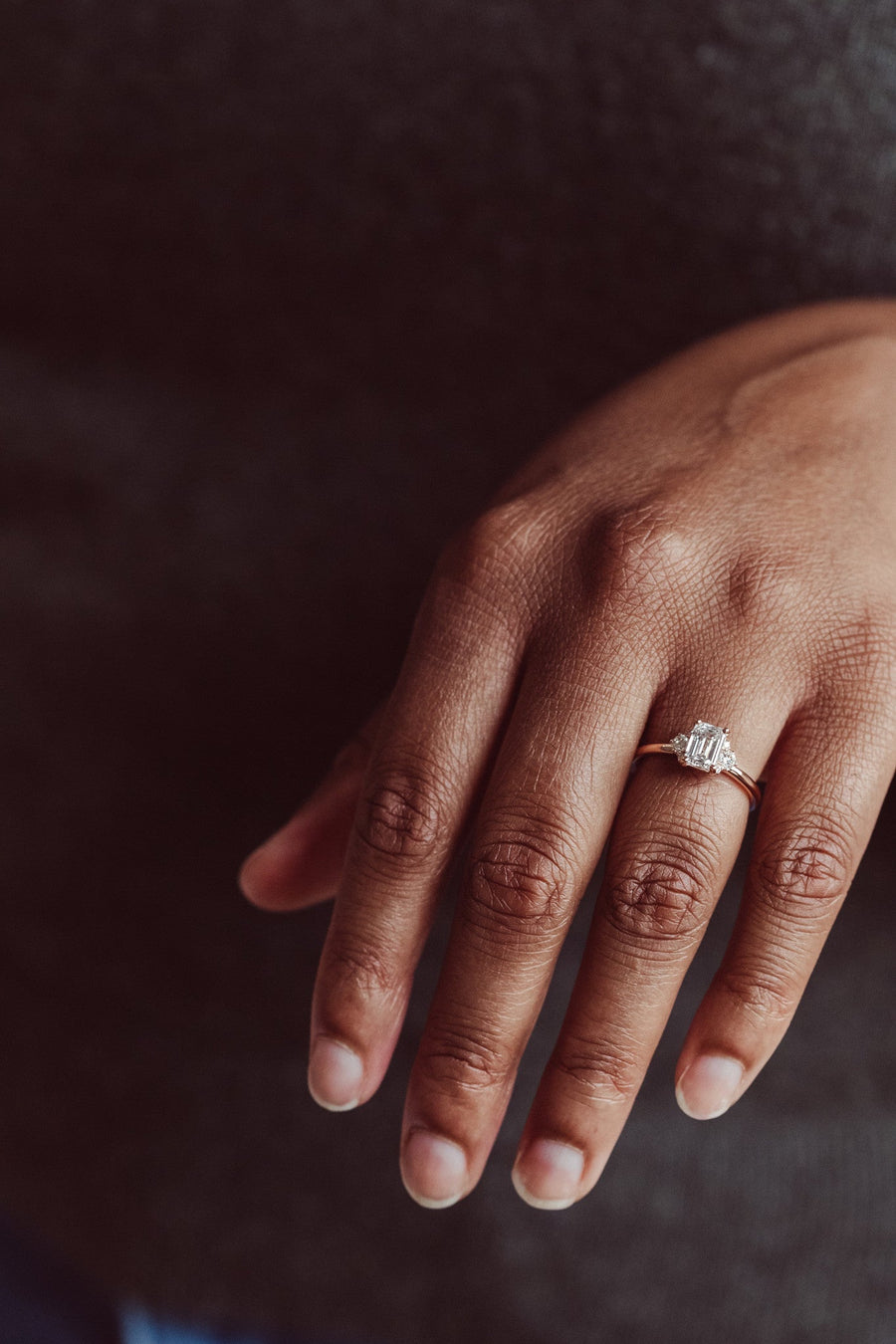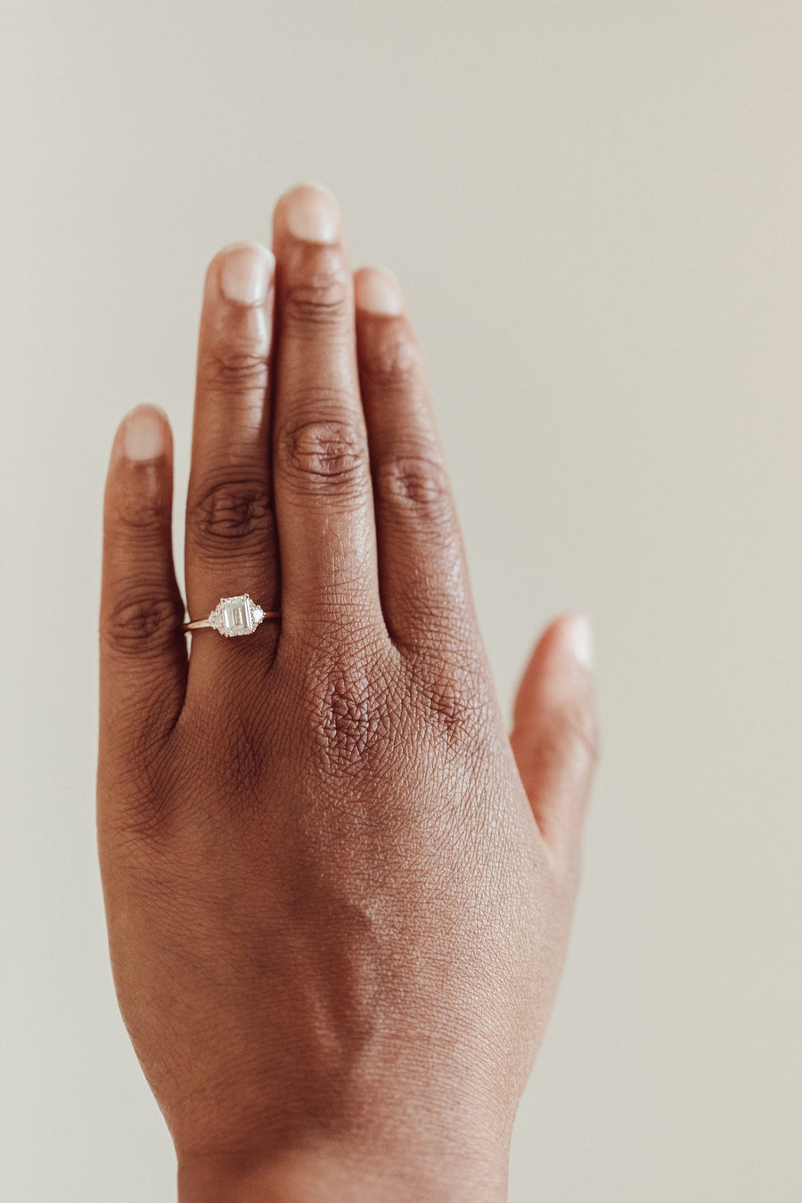 ✦ The Ring Shown in the Picture Holds a Beautiful 1.0 CT Emerald Cut Moissanite.